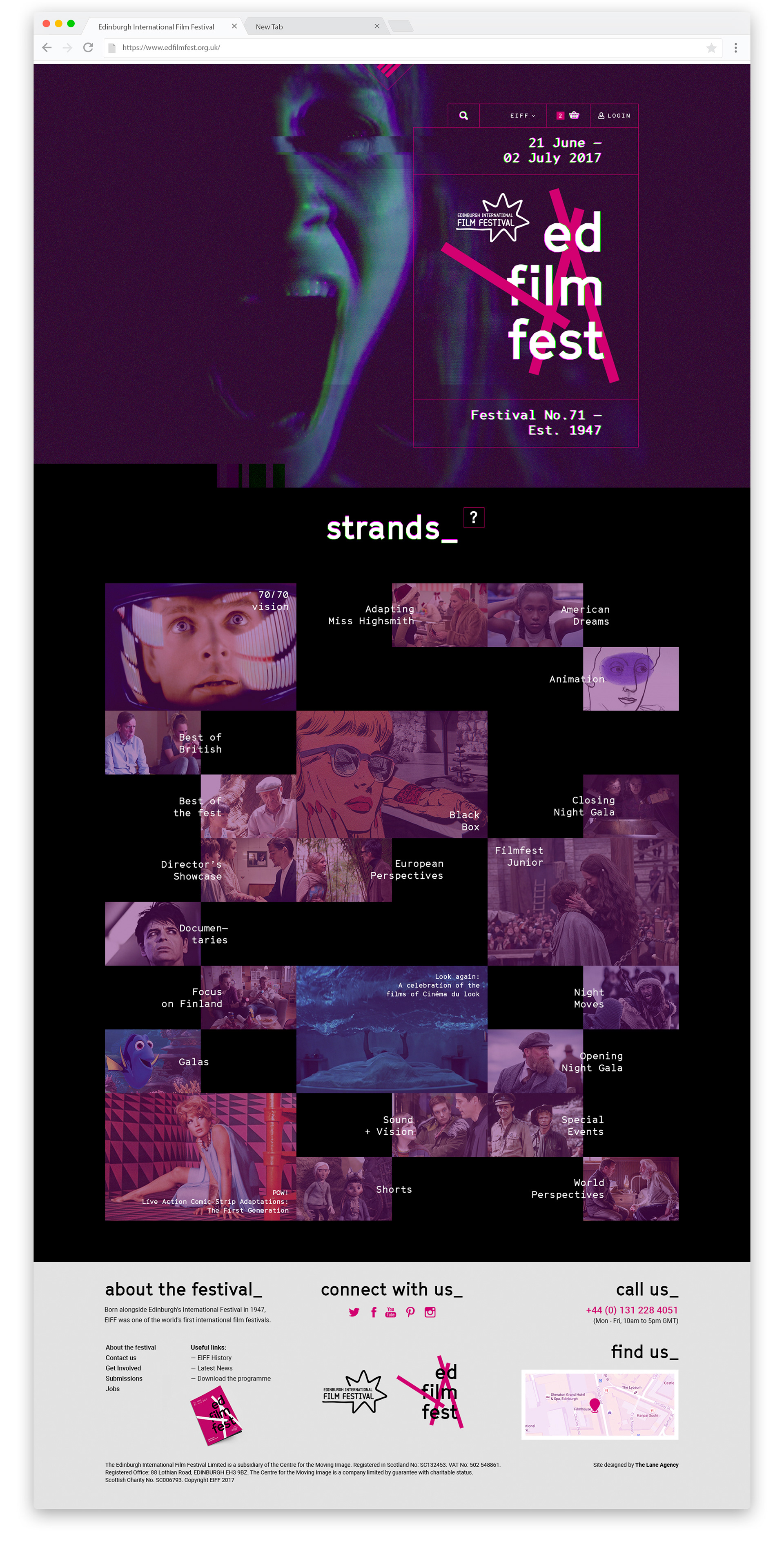 Art direction and designs created for the Edinburgh International Film Festival website pitch in 2017 as Creative Director of The Lane Agency. As part of The Lane Agency team, we had previously created the visual identity for the film festival which will run for 3 years.