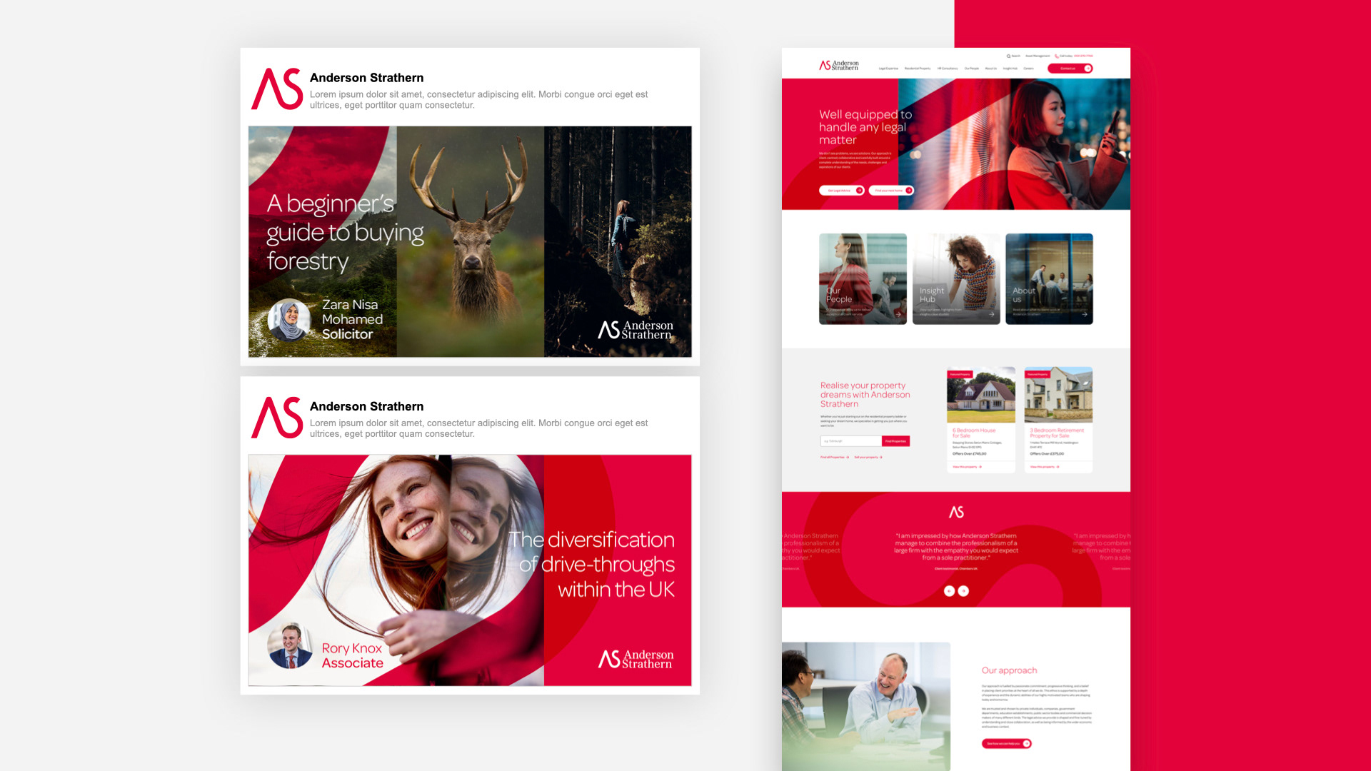 Visual identity for Anderson Strathern, a well known Scottish law firm, including digital illustrations depicting their Edinburgh & Glasgow heritage. Introducing a bold and ambitious design system incorporating a triptych for visual storytelling featuring the AS brand super-graphic, to represent a dynamic and progressive law firm.